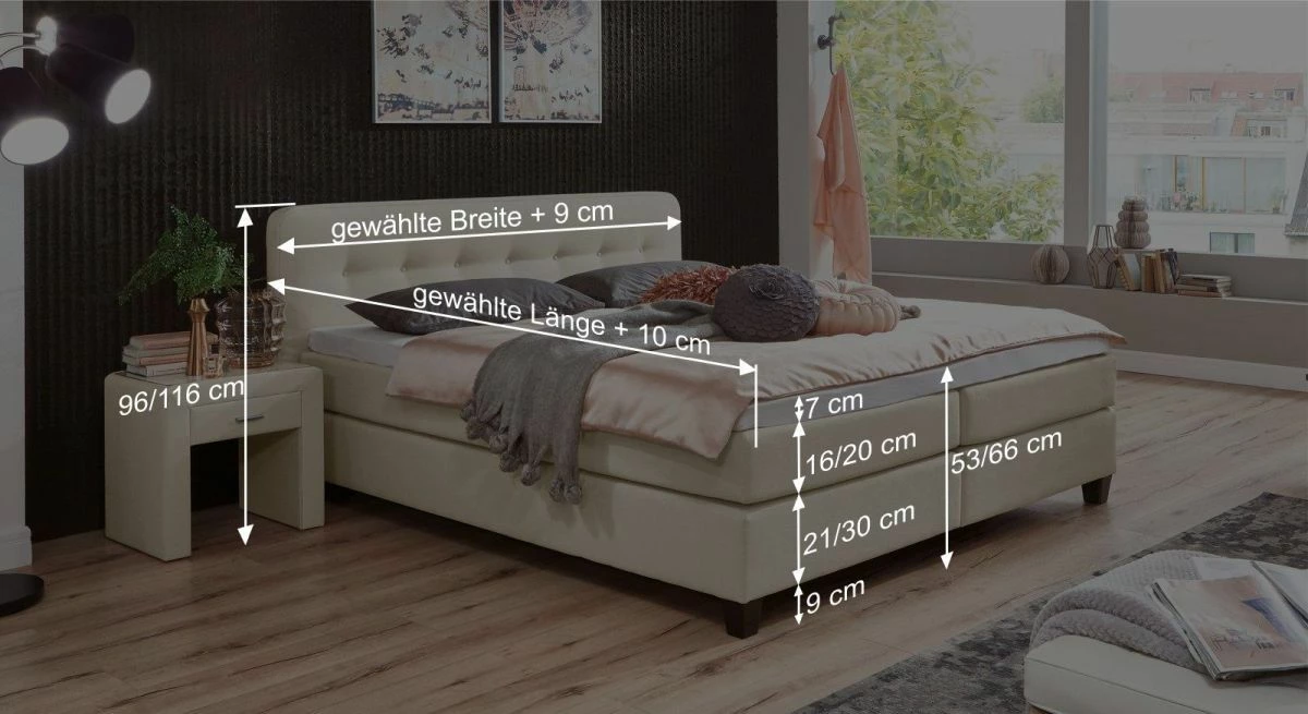 Die flexible Schlafstätte basiert auf dem hochwertigen Tiberio-Boxspringsystem. Dieses bietet Personen bis 120 kg Körpergewicht in jeder Schlaflage ein optimal abgestimmtes Liegegefühl. Die zeitgemäße Aufmachung des Boxspringbettes veredelt den luxuriösen Schlafkomfort und macht das Boxspringbett zu einem Gewinn in allen Belangen.