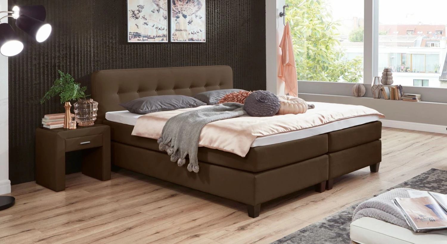 Das Boxspringbett „Westport“ besteht aus drei aufeinander aufgebauten Schichten (Box, Matratze und Topper), die in verschiedenen Ausführungen erhältlich sind und nach Belieben miteinander kombiniert werden können.