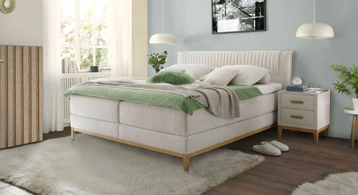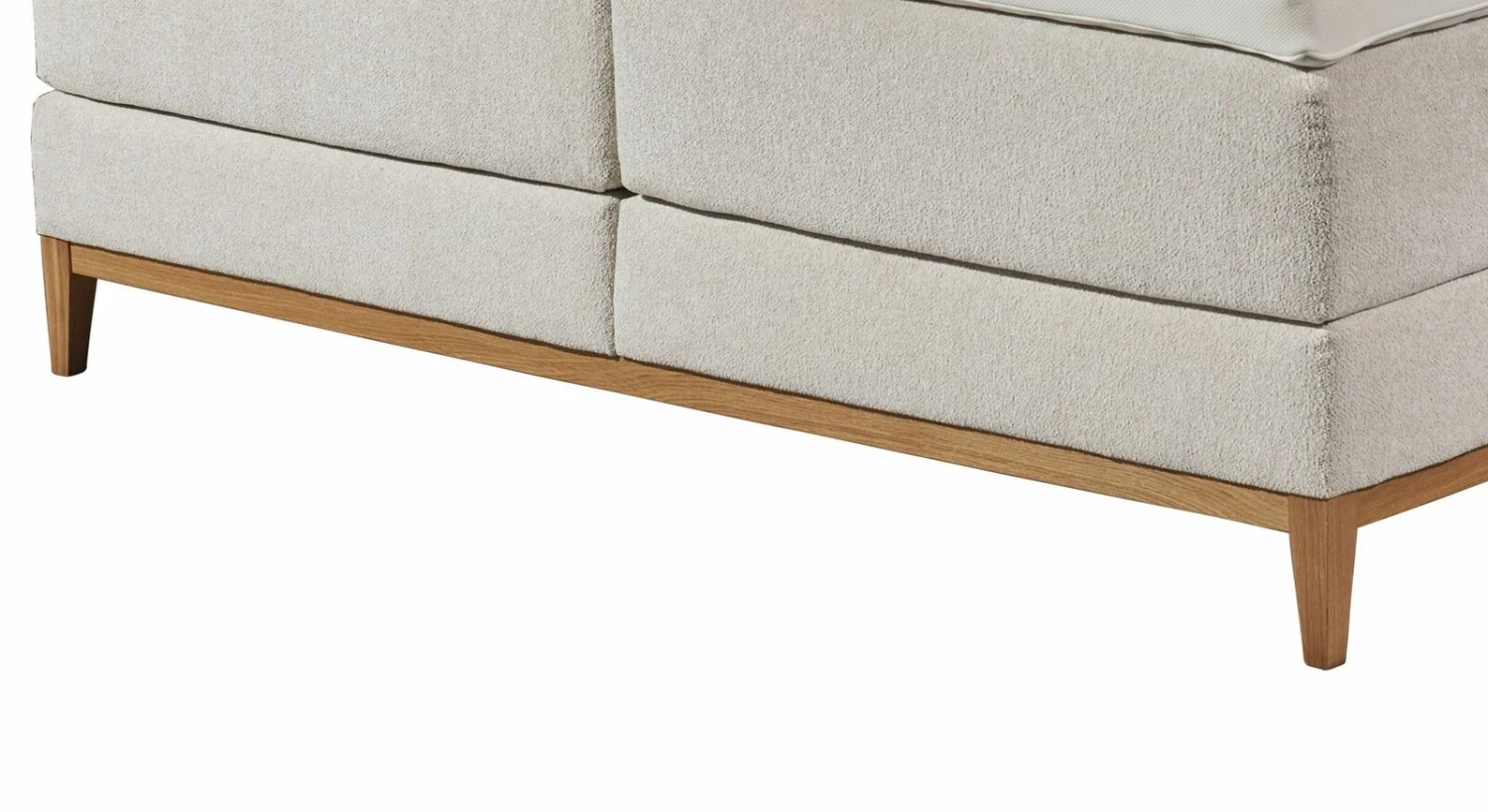 Getragen wird das Bett von einem stabilen Untergestell aus eichefarbigem Massivholz. Der warme Holzton harmoniert wunderschön zu dem hellen Stoffbezug und die filigranen Bettbeine verleihen dem Bett einen angenehm leichtfüßigen Charakter.