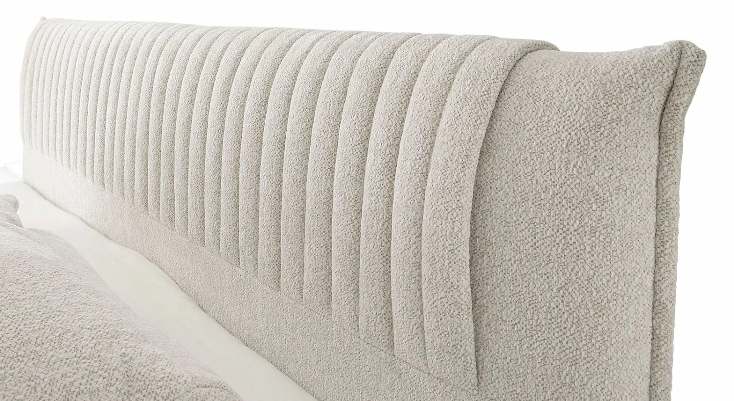 Als besonderes Highlight zieht das gepolsterte Kopfteil all seine Blicke auf sich. Mit dem seitlichen Stehsaum wirkt es wie ein großes Kissen. Der gesteppte Stoffaufsatz ist fest mit dem Kopfteil vernäht und verleiht dem Bett mit seiner linearen Streifenoptik einen modernen Look.