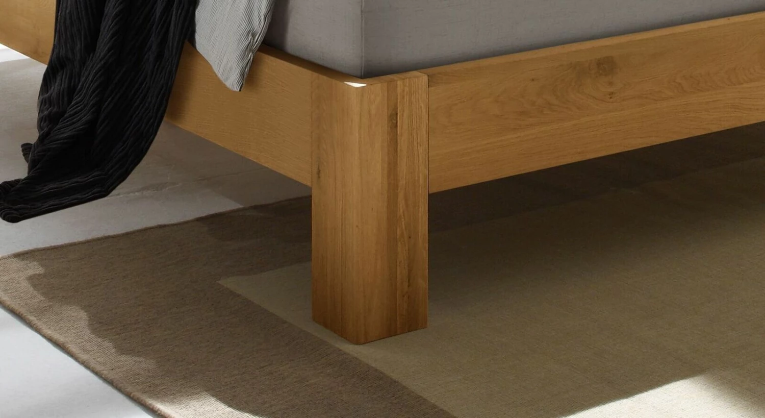 Trotz seines Boxspringsystems ähnelt die Liege „Kingston“ einem klassischen Massivholzbett. Denn sowohl der Bettrahmen als auch die robusten, breiten Füße sind aus langlebigem Eichenholz gefertigt. Die sorgfältig gebürstete Oberfläche des Gestells wird anschließend in Natur, Cognac oder Graphit geölt, um die finale Farbgebung zu erhalten.