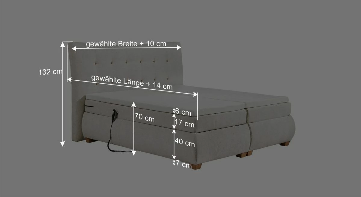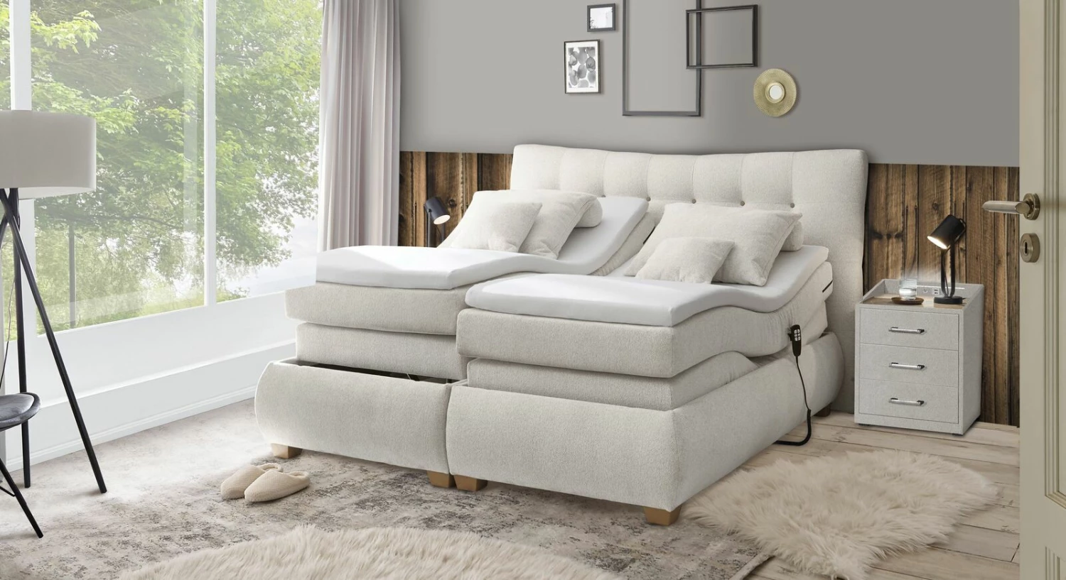Das voluminös aufgepolsterte Boxspringbett erfüllt all Ihre Wünsche, denn neben einer hochwertigen Bettausstattung mit Tonnen-Taschenfederkern-Matratze und Kaltschaum-Topper bietet Ihnen die Schlafstätte auch elektrisch verstellbare Liegeflächen. So können Sie im Bett bequem lesen, fernsehen oder einfach nur entspannen und sich vom Alltag davonträumen.