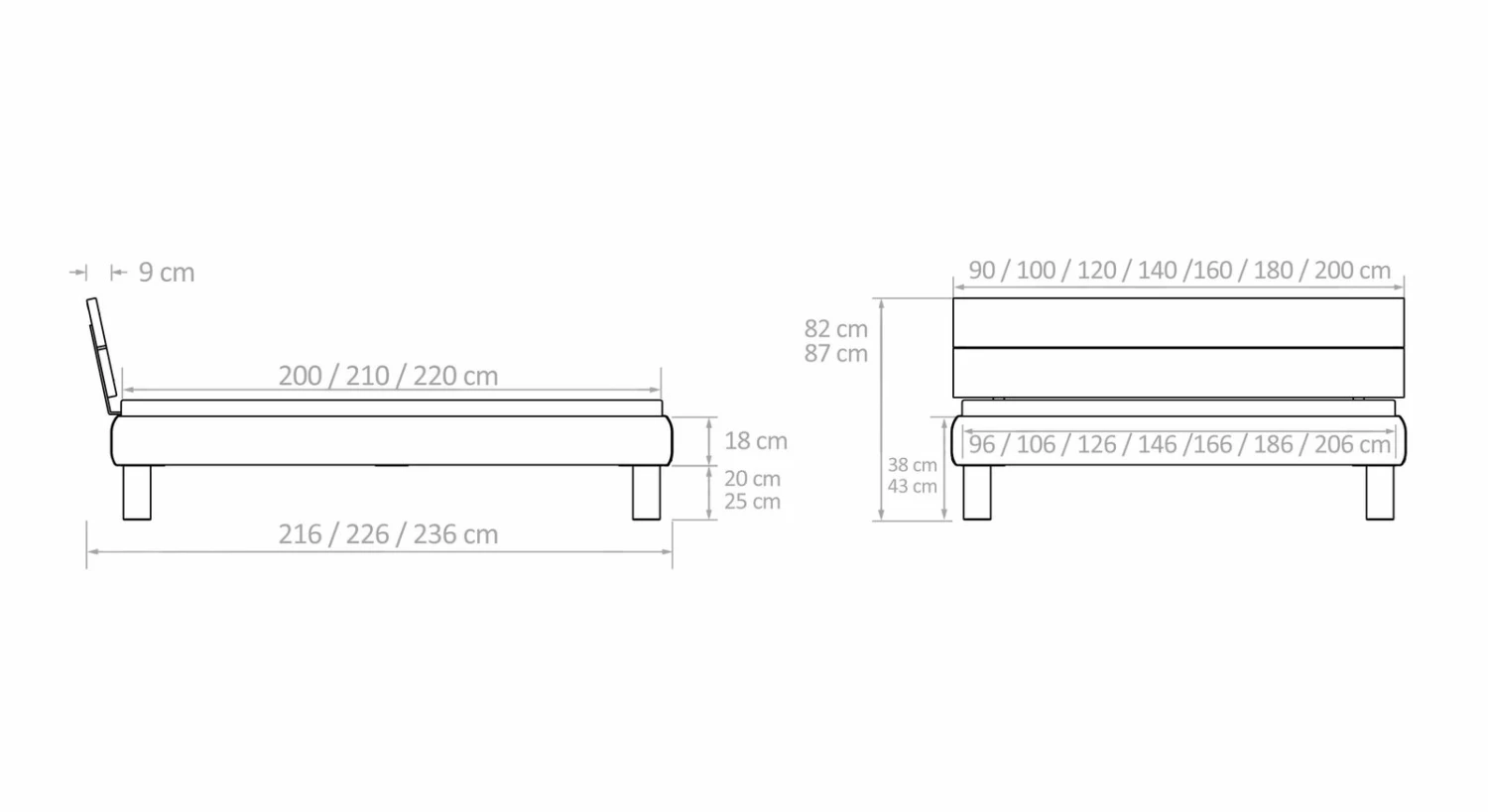 Breite + 6 cm - Kopfteilhöhe: 82 cm, 87 cm