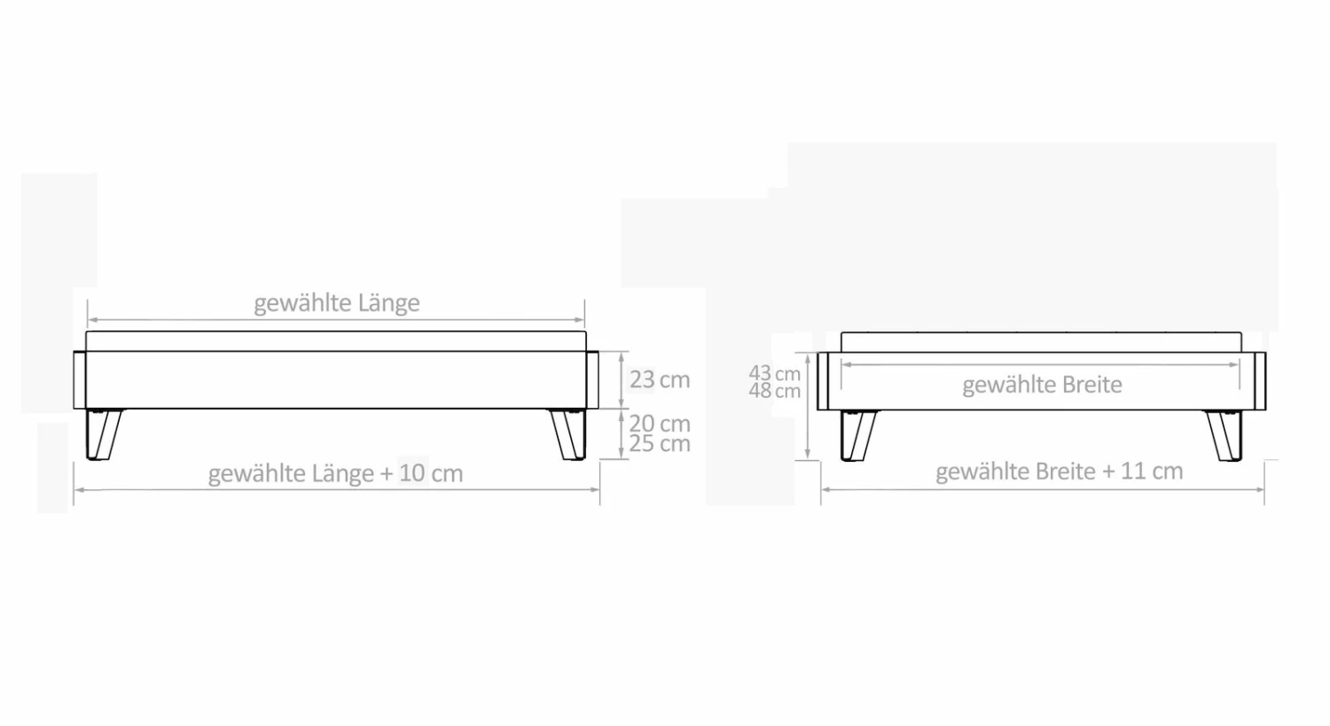 Breite + 11 cm - Bettrahmenhöhe: 43 cm, 48 cm