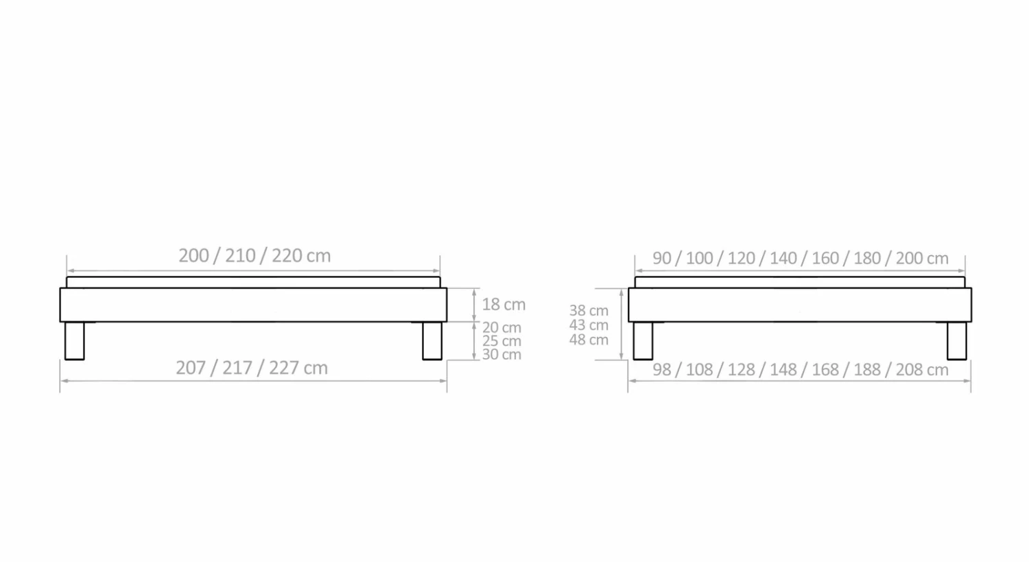 Breite + 8 cm - Bettrahmenhöhe: 38 cm, 43 cm, 48 cm