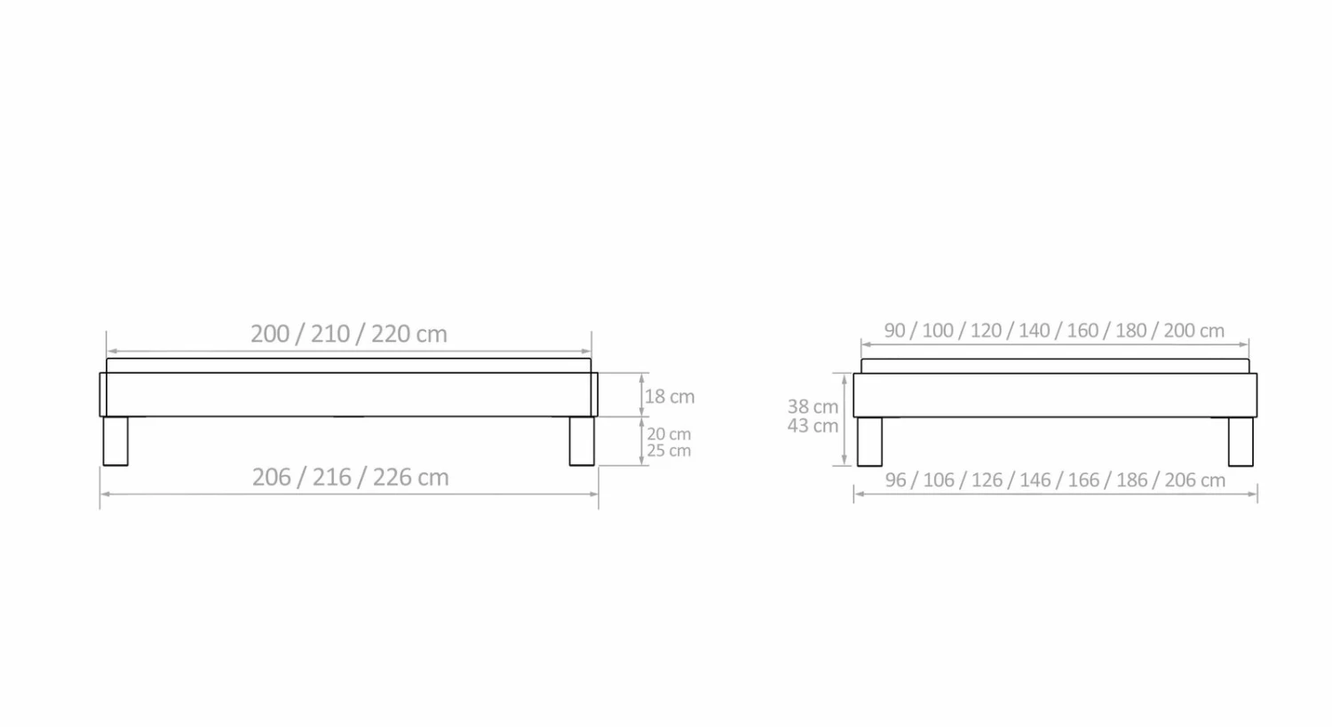 Breite + 6 cm - Bettrahmenhöhe: 38 cm, 43 cm