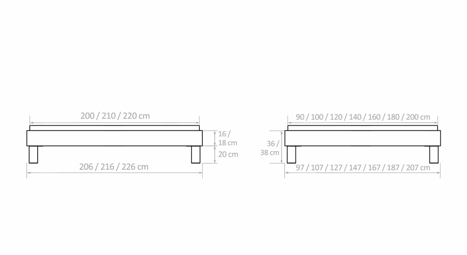 Breite + 7 cm - Bettrahmenhöhe: 36 cm, 38 cm