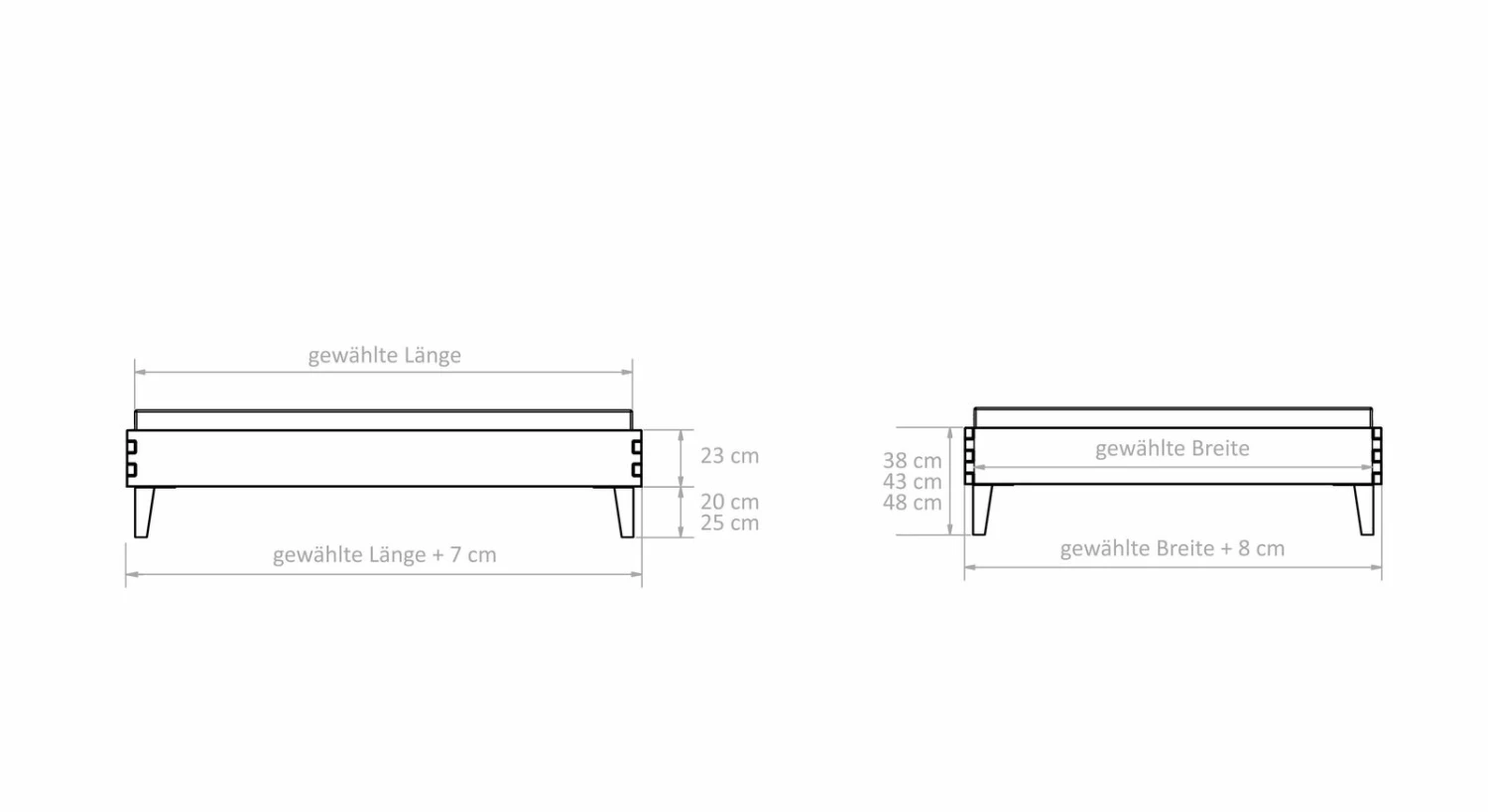 Breite + 8 cm - Bettrahmenhöhe: 38 cm, 43 cm, 48 cm