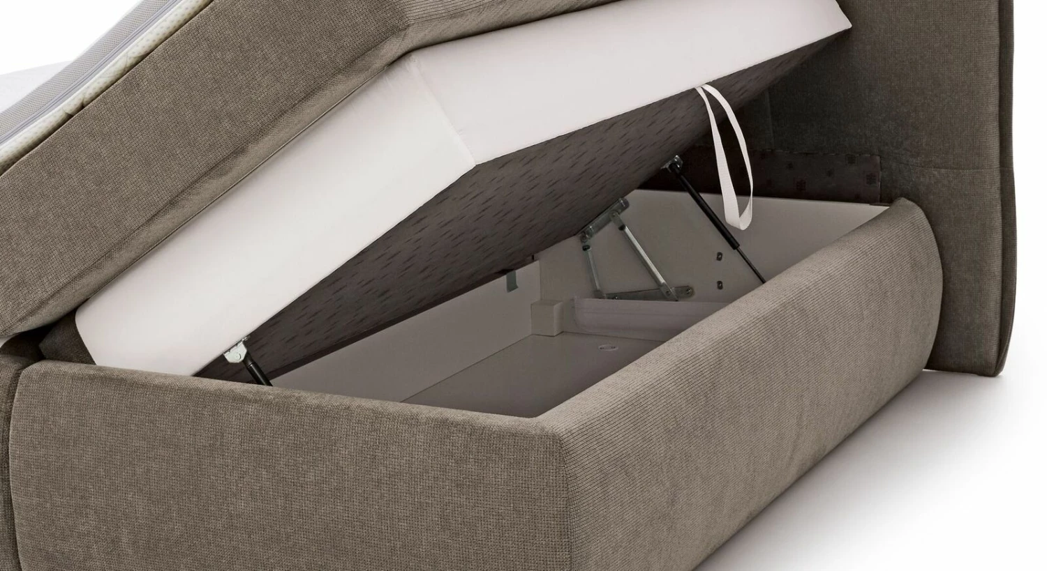 Sich für den Komfort eines Boxspringbettes zu entscheiden, heißt keinesfalls, auf praktische Funktionalitäten zu verzichten, die Ihnen den Alltag erleichtern. Das MUSTERRING Boxspringbett „Felina-Case“ Fledermaus zeigt, wie es geht: Im Unterbau ist seitlich je ein Bettkasten eingearbeitet. Zum Öffnen greifen Sie einfach an das Textilband an der Box und heben die Liegefläche an.