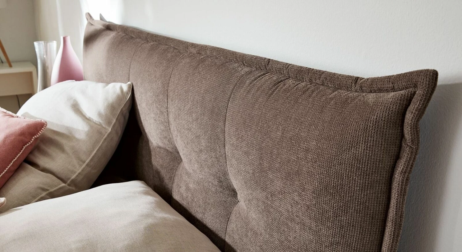 Das Modell „Felina-Case“ überzeugt im neu aufgelegten Landhausstil. Typisch für diese Stilrichtung: Das hohe Kopfteil im Flatterdesign – auch Fledermaus genannt – verfügt über eingearbeitete Ziernähte und Knopfheftungen, welche die Optik des Bettes maßgeblich mitbestimmen. Eine umlaufende Biese sorgt dafür, dass das Betthaupt auf ansprechende Art und Weise wie ein gemütliches Kissen wirkt.