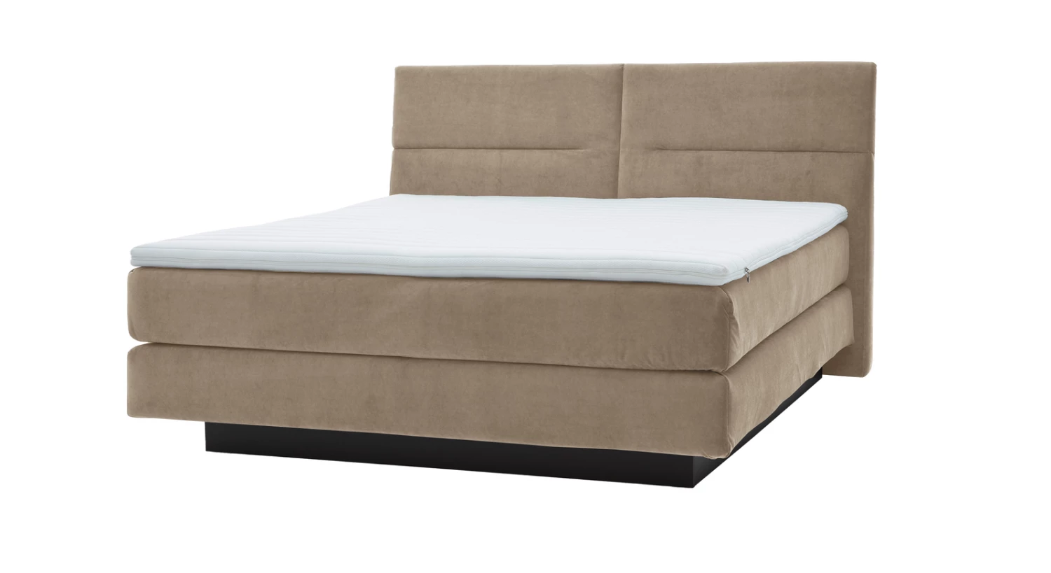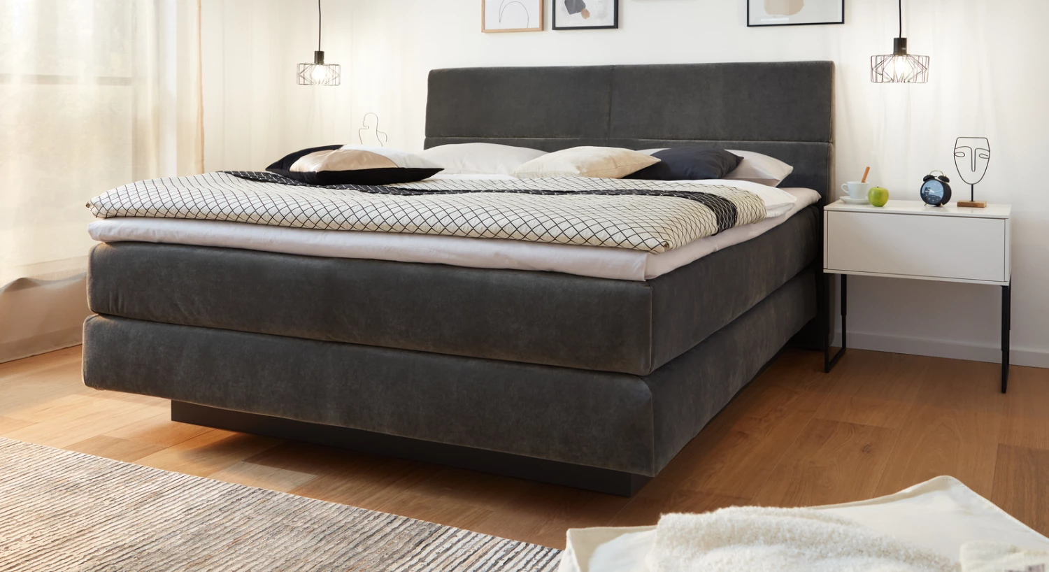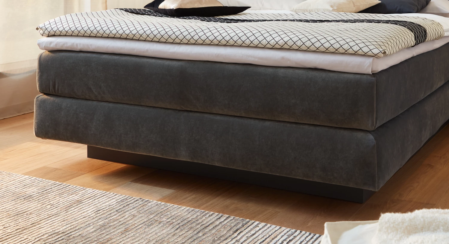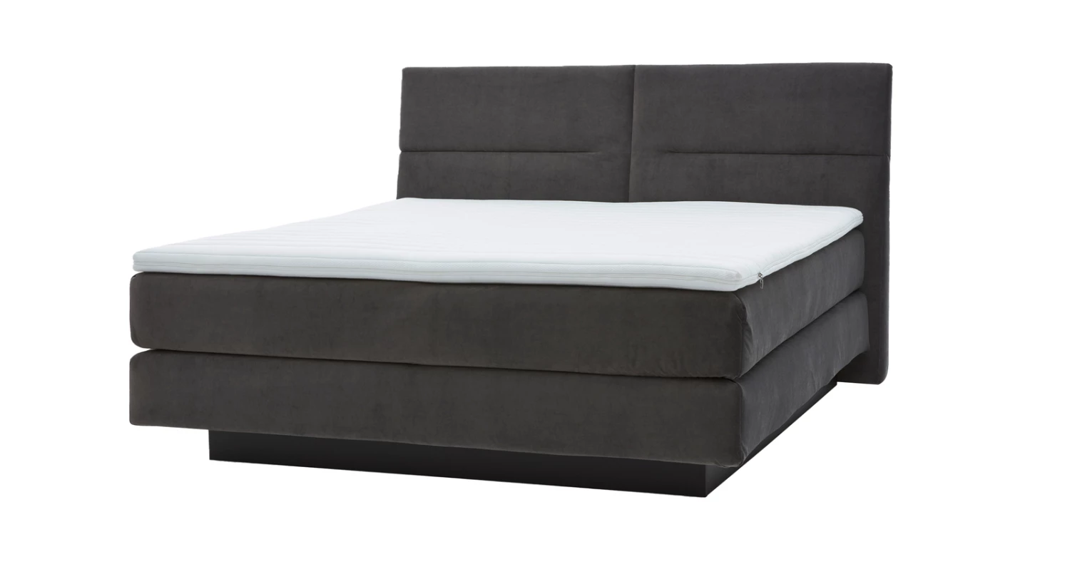 Das hochwertige Boxspringbett aus dem Hause MUSTERRING wird von einem anthrazitfarbenen Holzsockel getragen. Der Sockel geht nicht über die gesamte Länge des Bettes, sondern ist etwas verkürzt. Dadurch entsteht unter dem Bett ein Freiraum, der die Illusion erweckt, das Bett würde im Raum schweben. Diese Raffinesse unterstreicht noch einmal die geradlinige Optik des attraktiven Boxspringbettes.