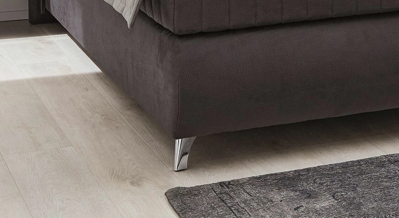 Als glänzendes Highlight fungieren die elegant geschwungenen Beine am Fußende, die aus verchromtem Stahl gefertigt sind und die gerundete Formgebung des Fußendes nochmals aufgreifen.