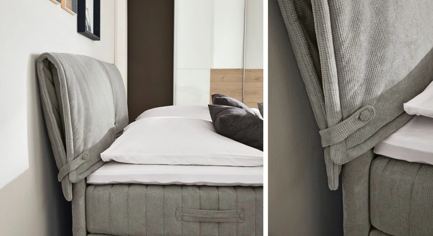 Die Basis für einen optimalen Liegekomfort bildet entweder die Bonell-Federkern-Box oder die 7-Zonen-Tonnen-Taschenfederkern-Box. Diese wird mit einer für Sie geeigneten Matratze kombiniert. Drei unterschiedliche Modelle in verschiedenen Härtegraden stehen Ihnen hier zur Auswahl. Sollten Sie und Ihr Partner unterschiedliche Härtegrade benötigen, können wir Ihnen mit den MUSTERRING Misch-Härtegraden „Felina“ hier weiterhelfen.