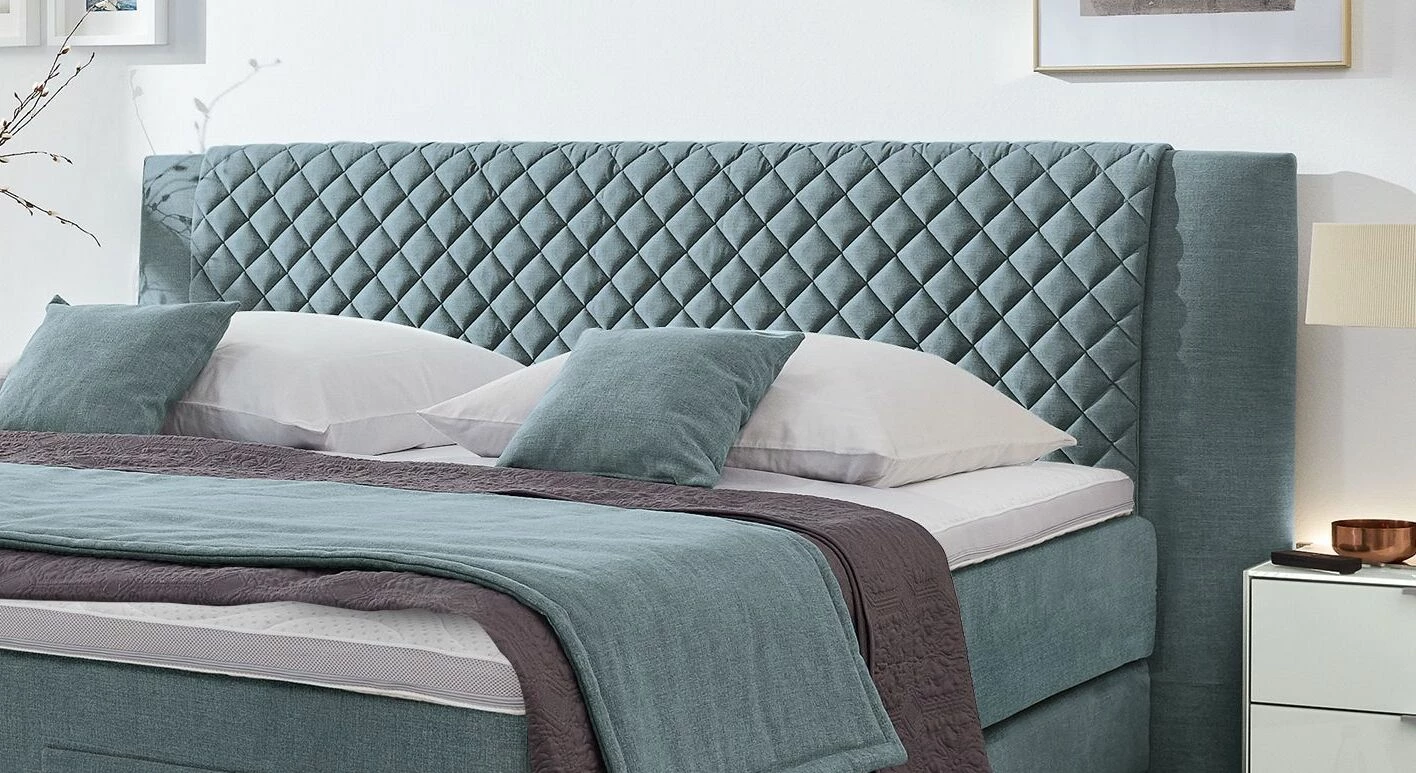 Bereits auf den ersten Blick fällt das extravagante Design des Kopfteils ins Auge. Ein mittig angebrachter Überwurf mit Rautensteppung lockert das große Betthaupt elegant auf und verleiht dem MUSTERRING Boxspringbett ein modernes Aussehen.