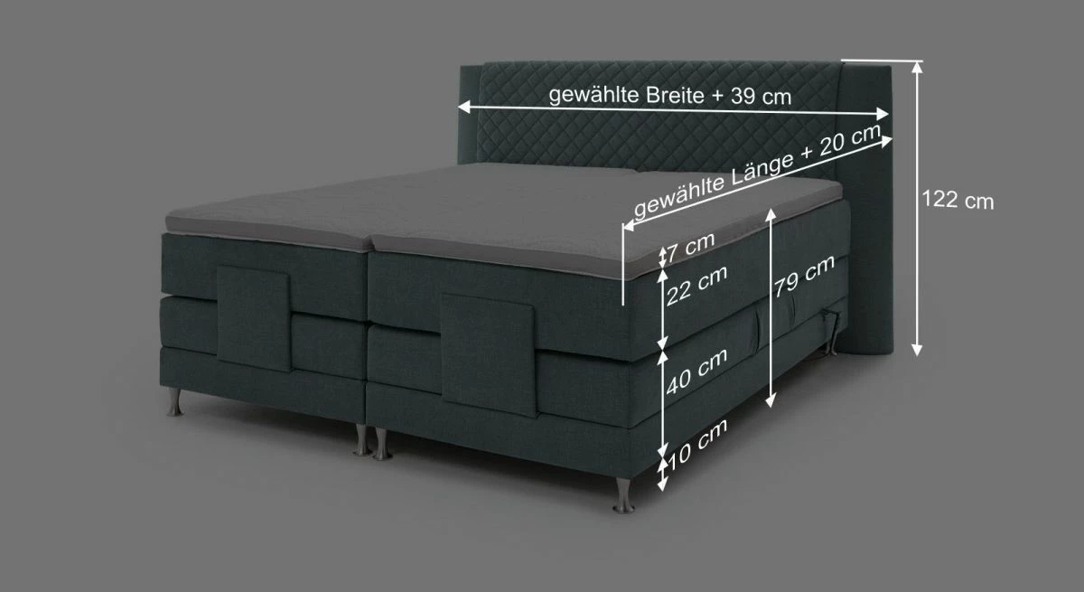 Auch Box, Matratze und Elektro-Unterbau sind passend zum Kopfteil in einen pflegeleichten Stoff gehüllt, sodass ein einheitliches Gesamtbild entsteht. Zur Auswahl stehen verschiedene Bezugsarten in diversen Farben, damit Sie Ihr neues Bett perfekt auf Ihren Einrichtungsstil abstimmen können.