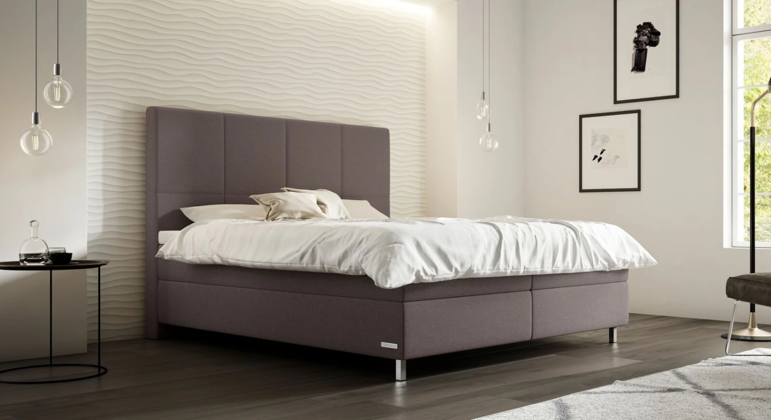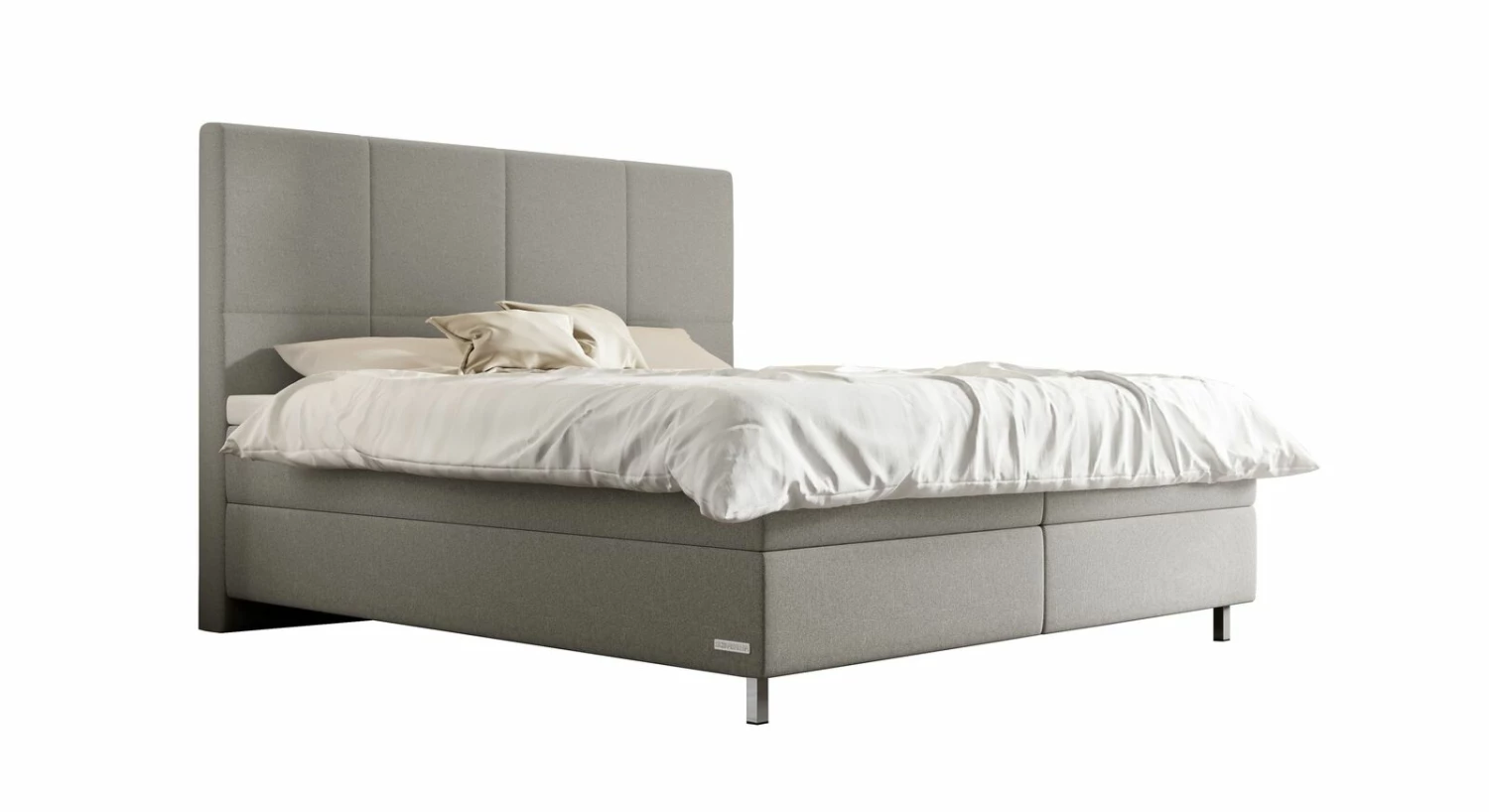 Das moderne Design des Boxspringbettes zeigt sich unter anderem an der Formgebung: Die geradlinige Optik ist sowohl im kantigen Design der Füße aus Metall als auch in der Gestaltung des hohen Kopfteils zu finden.