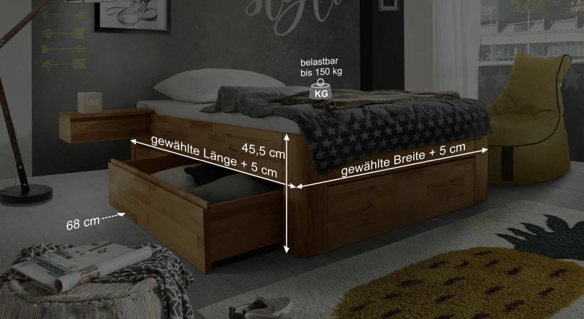 Breite + 5 cm - Bettrahmenhöhe: 45,5 cm