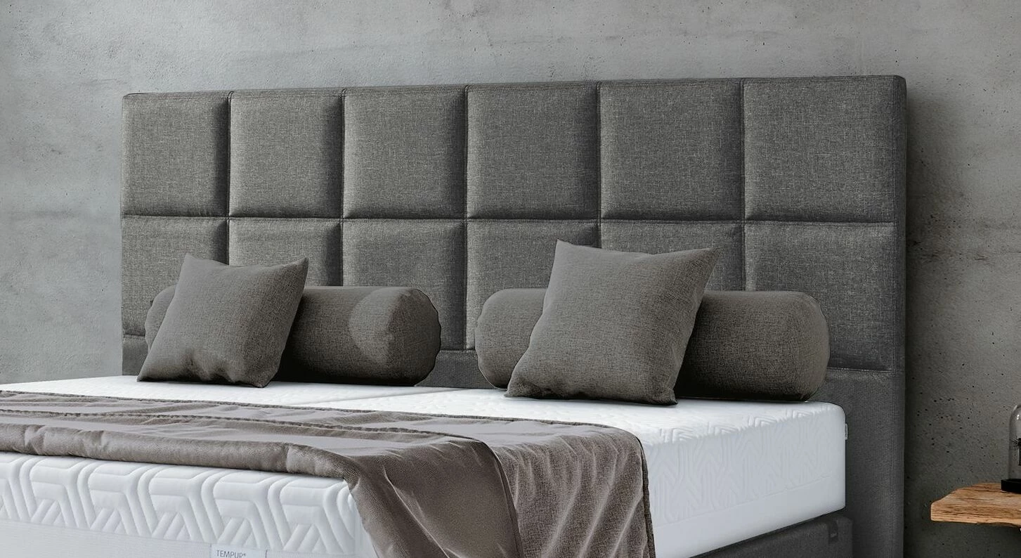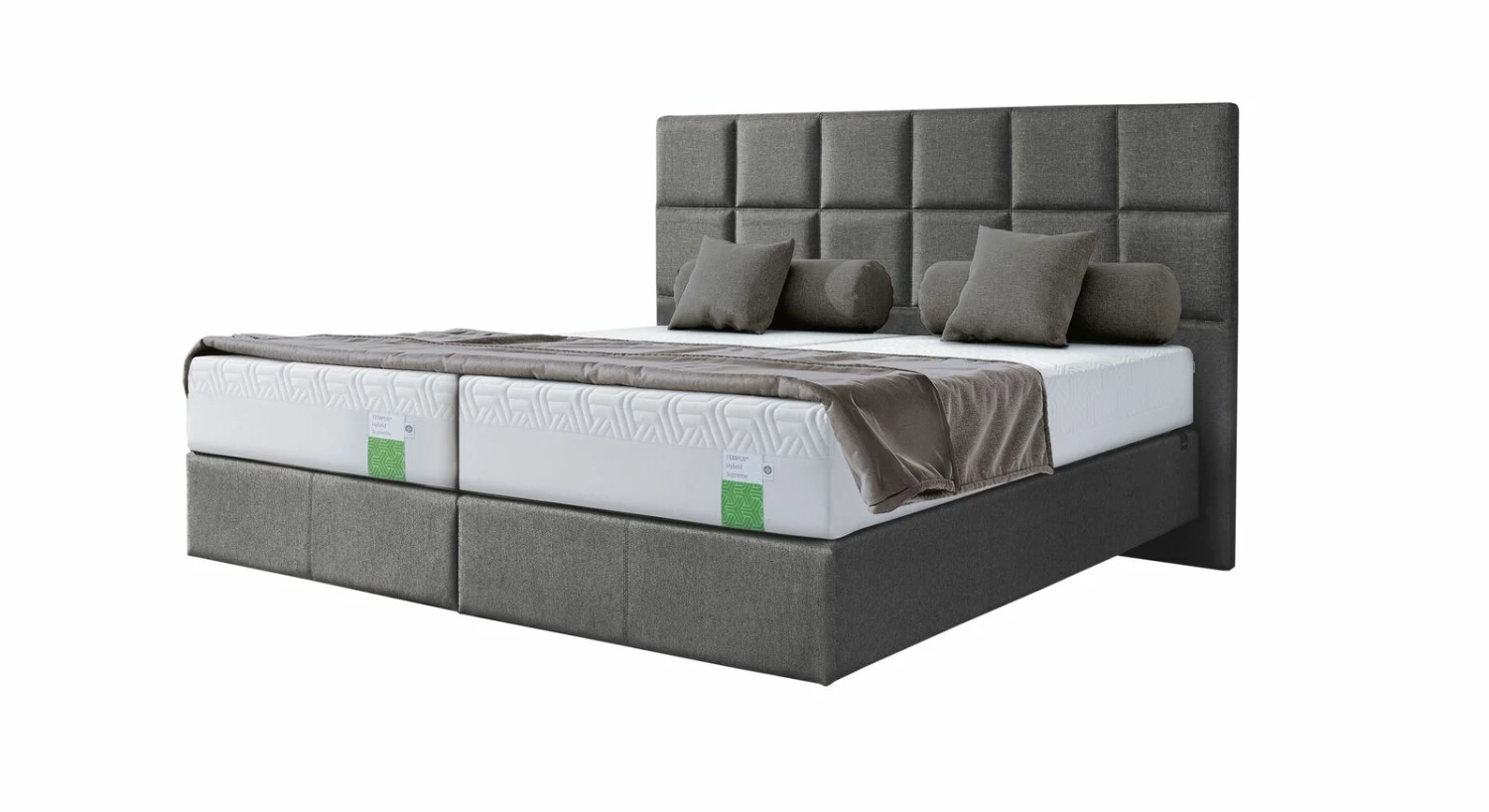Das optische Highlight des Bettes aus dem Hause TEMPUR® ist das quadratisch gesteppte Polster-Kopfteil. Es ist mit weichem Webstoff bezogen und lädt dazu ein, sich entspannt zurückzulehnen. Das gerade Betthaupt geht bis auf den Boden hinunter und ersetzt so die Beine an dieser Seite. Der durch die Matratze verdeckte Bereich ist wie der Bettrahmen gleichermaßen mit grauem Webstoff bezogen. So sieht das elegante Elektro-Boxspringbett auch von der Seite wunderschön harmonisch aus.