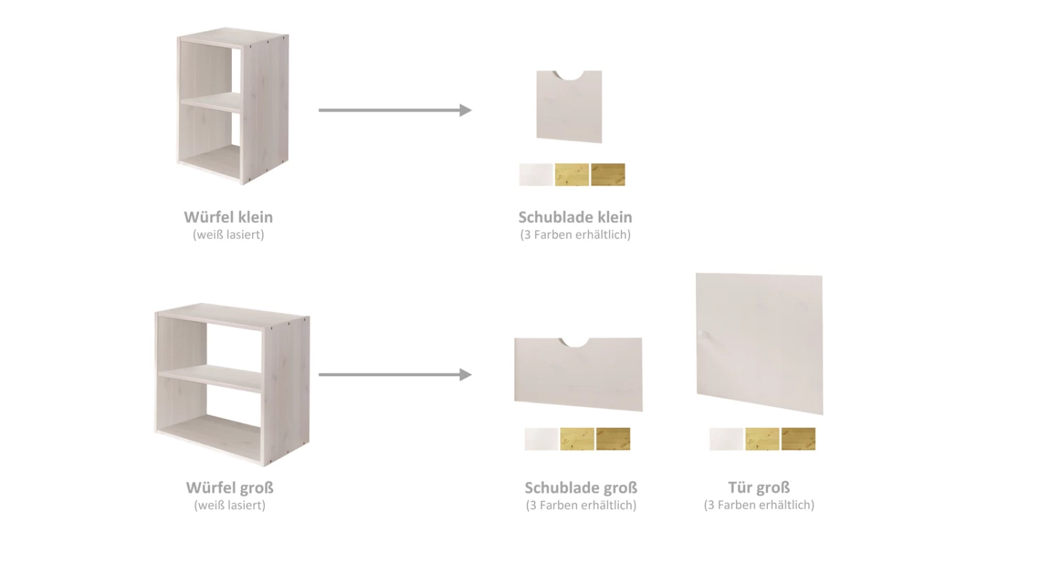 | Artikel | Würfel klein, Würfel groß, Tür für Würfel groß, Schublade für Würfel klein, Schublade für Würfel groß |
